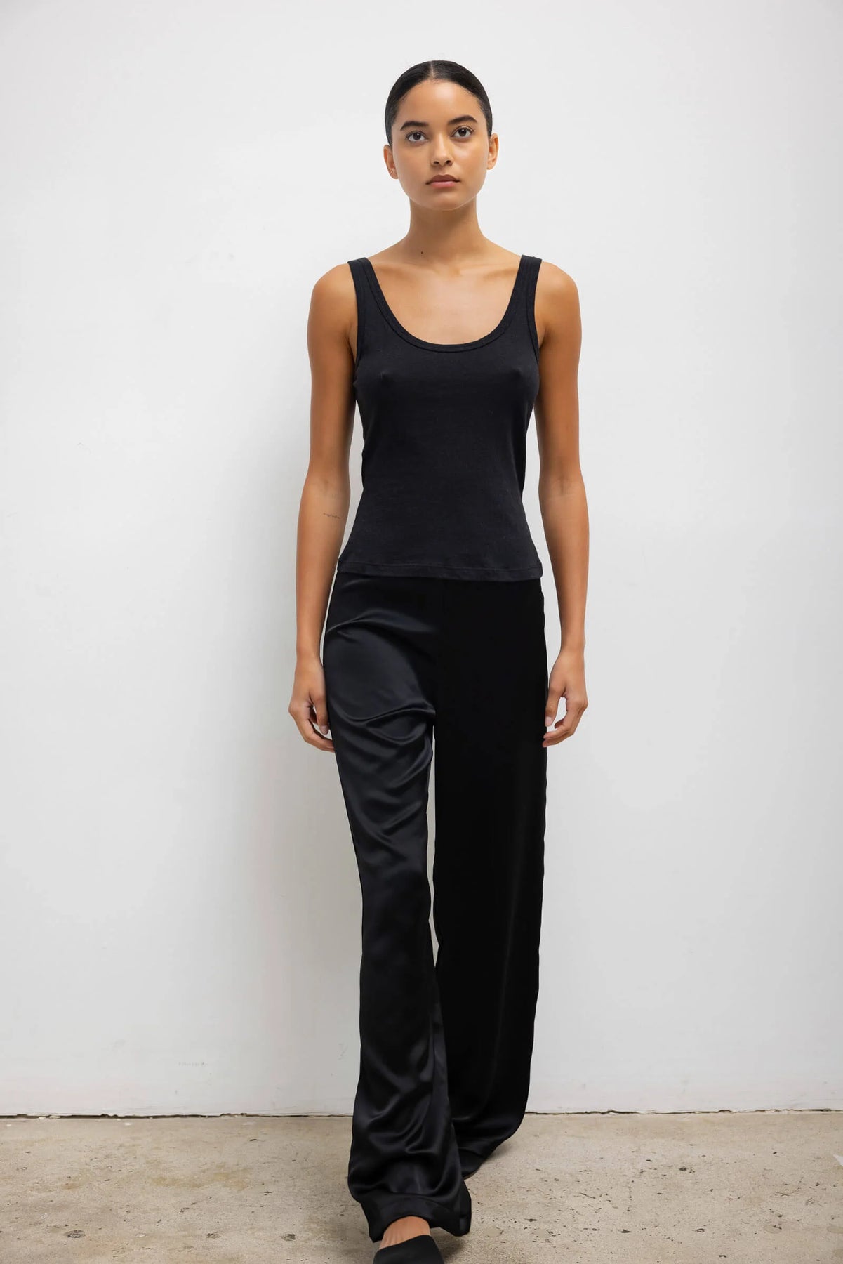 Cut in our Japanese-crafted satin, The Barb Wide Leg Pant is our bestselling option for everyday elegance. This easy pull-on silhouette features a thin elastic mid-rise waistband and a relaxed, perfectly draped wide leg.