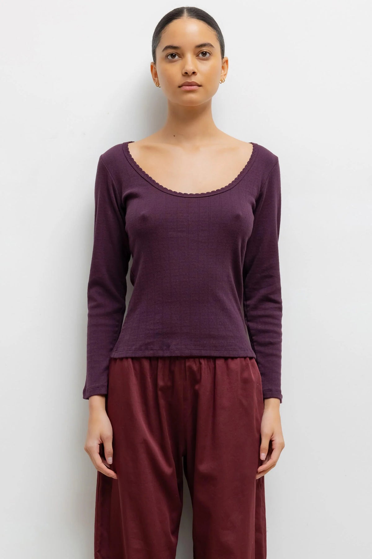 Cut in our nostalgic Pointelle Cotton, The Pointelle Slim Fit Long Sleeve features a flattering scoop neckline with our signature pinhole stripes, dainty eyelets, and scalloped edging. Full length with fitted long sleeves.