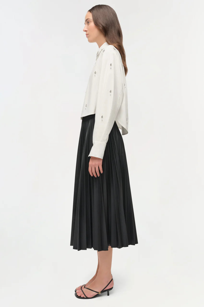 A cropped shirt cut from cotton poplin, speckled with hand-applied embellishments. Crystal-and-pearl motifs are thoughtfully placed across the fabric, while the collar is framed with intricate beadwork that catches the light like fine jewelry. Crisp tailoring meets artisanal detailing, creating a piece that feels both modern and timeless.