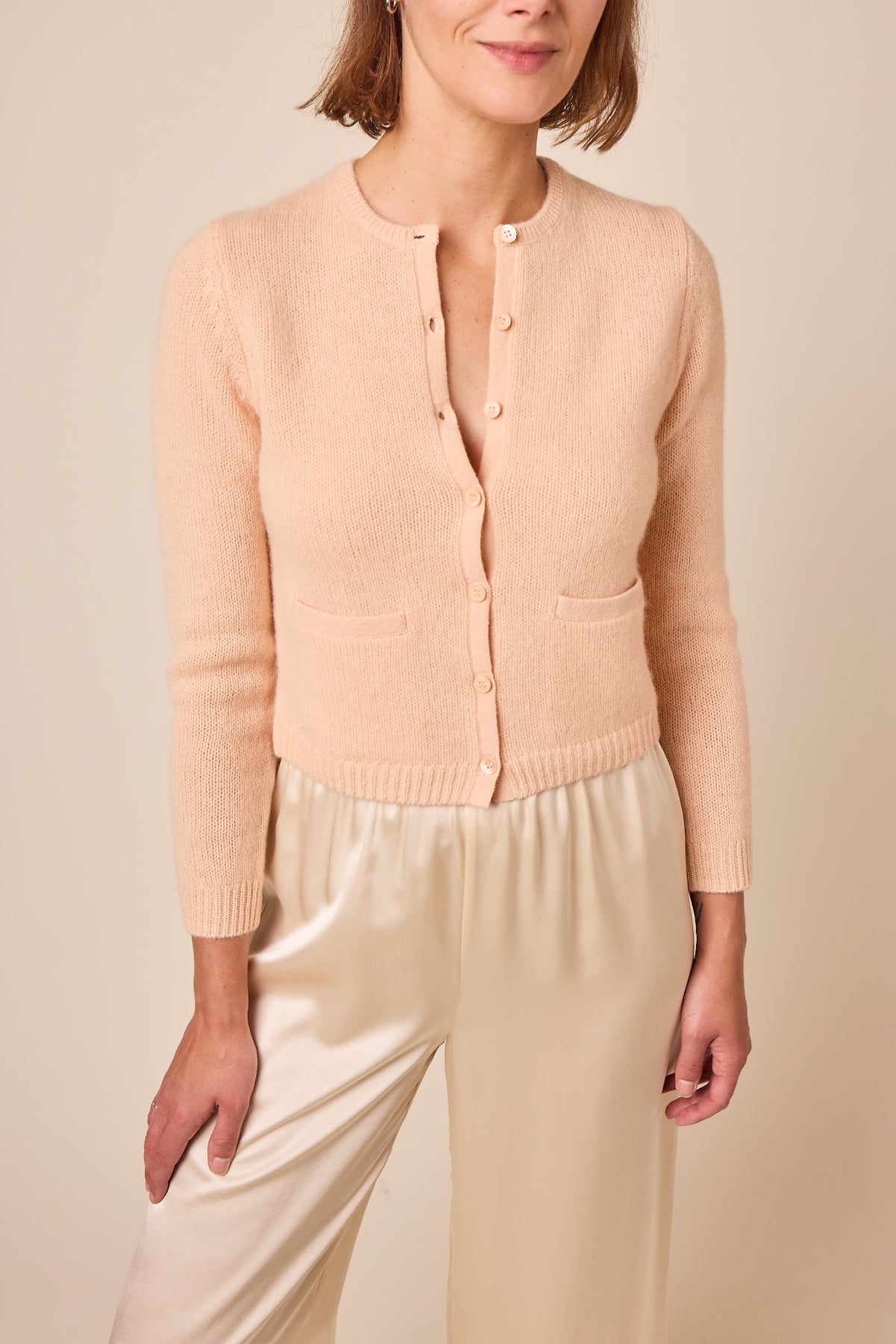 Knitted from cloud-soft 100% cashmere, the Thea Cardigan features a classic crew neckline, a fitted silhouette, and bracelet-length sleeves. It’s finished with two petite pockets, a line of mother-of-pearl buttons down the front, and ribbing at the cuffs and hem.