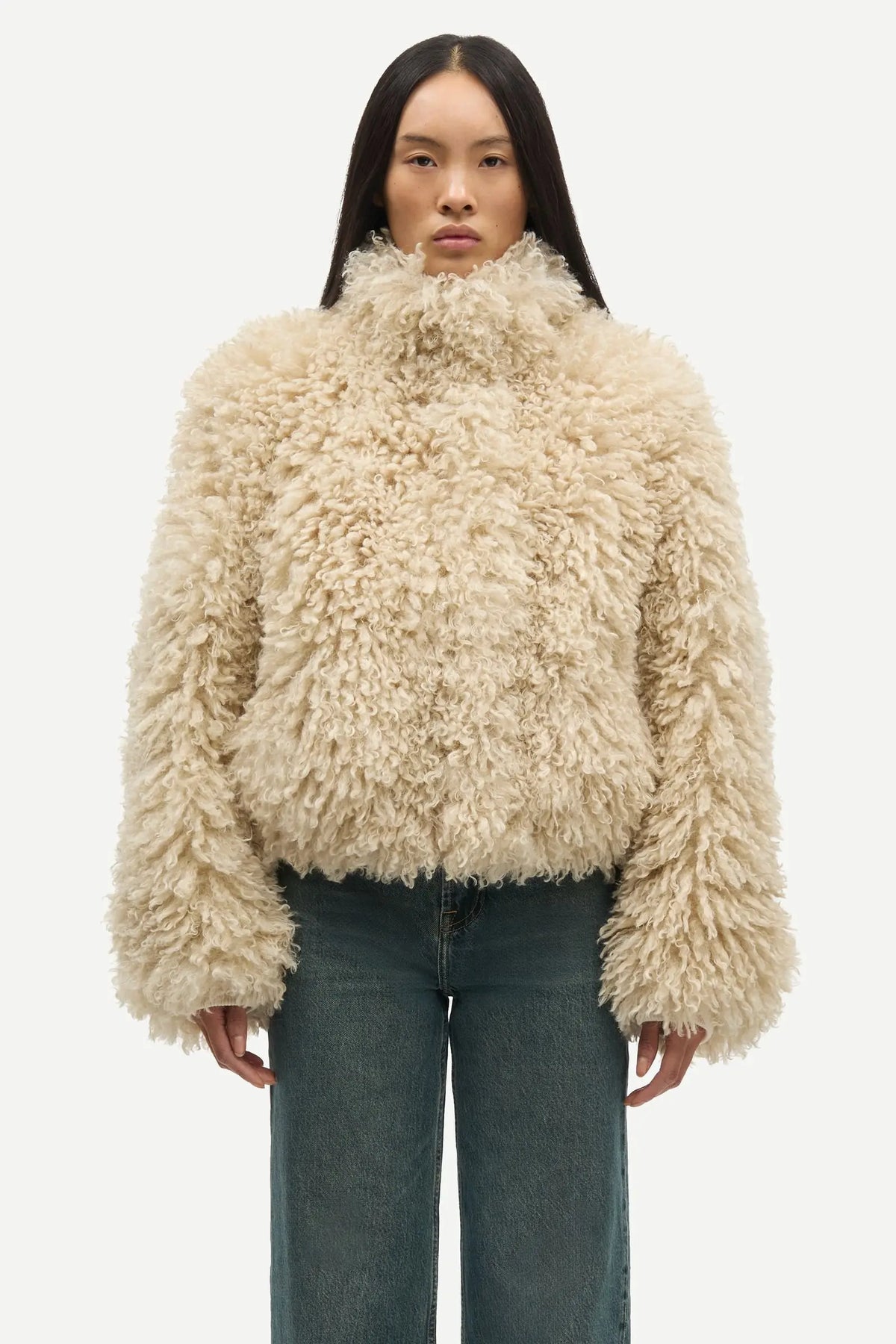 Faux fur jacket with an oversized fit. Hidden snap button and zipper closure on the front. Rib-knitted cuffs and elasticated hem. Side slit pockets on the front. Lightly padded. Fully lined. Main material made from 100% recycled polyester.