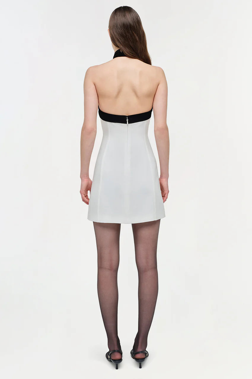 This mini dress is crafted in crisp crepe, defined by a velvet halter neckline that ties into a sculptural bow. Features a clean A-line shape and plush ribbon detail to bring depth and contrast. An expression of modern elegance, it showcases craftsmanship through simplicity and detail.