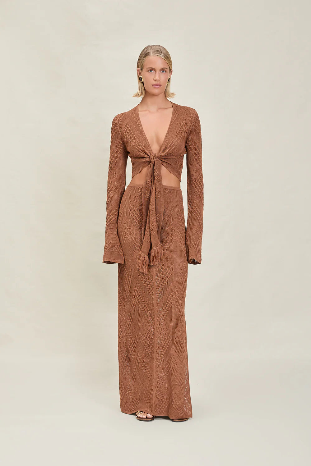 The Vie is a knit maxi skirt with an elastic waistband and side slit. Pairs back with the Vale Top.